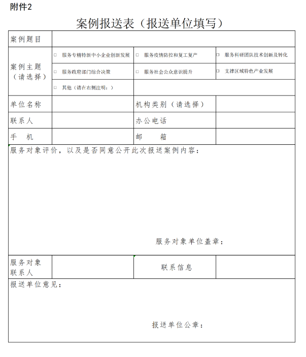 (二)严格审核材料。各省级知识产权管理部门要对案例材料进行审核,确保推荐上报案例的质量。TISC、高校国家知识产权信息服务中心和国家知识产权信息公共服务网点需填写《案例报送表》(附件2)并由所在单位盖章,连同对应案例一并报送省级知识产权管理部门。