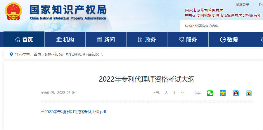 2022年7月4日,国家知识产权局发布了《2022年专利代理师资格考试大纲》。