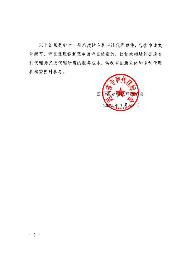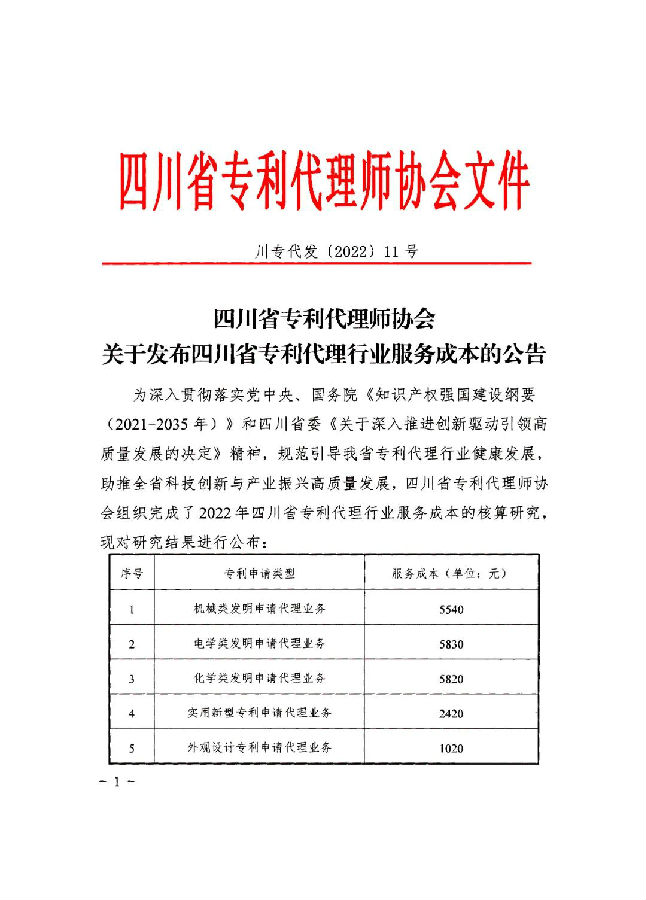 四川省专利代理师协会关于发布四川省专利代理行业服务成本的公告