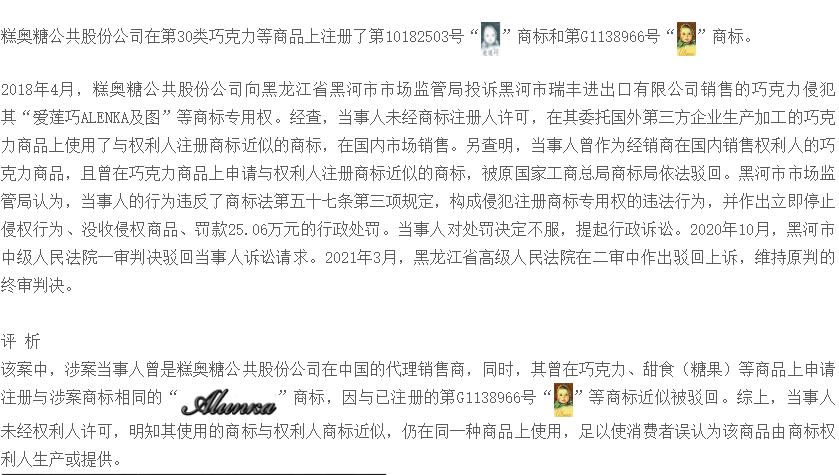 黑龙江省黑河市市场监管局查处侵犯“爱莲巧ALENKA及图”等注册商标专用权案