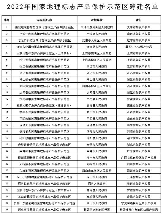 按照《国家知识产权局办公室关于组织开展2022年国家地理标志产品保护示范区申报推荐工作的通知》(国知办函保字〔2022〕490号)要求,经各地人民政府自愿申报、省(区、市)知识产权局遴选推荐,国家知识产权局对申报推荐名单进行综合评审,拟定了2022年国家地理标志产品保护示范区筹建名单,现将名单予以公示(详见附件),公示期为30个工作日(2022年8月22日至2022年9月30日)。