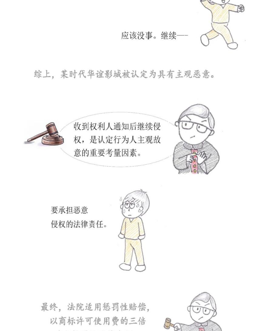 二审期间,某时代华谊影城的上诉理由主要为:其系个体工商户,法律意识不强,且律师函无法律效力,不能因为其在收到权利人律师函后未予回应就认定其具有侵权恶意。