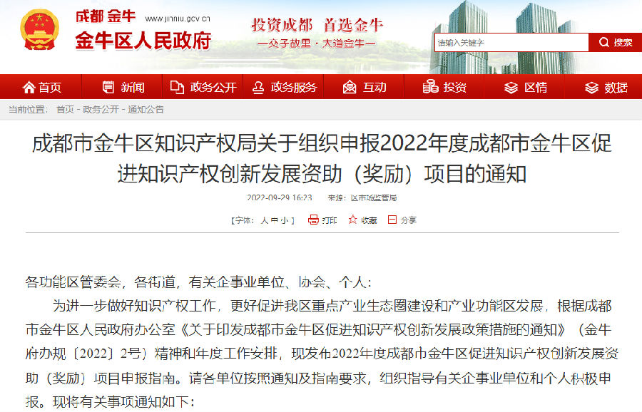 为进一步做好知识产权工作,更好促进我区重点产业生态圈建设和产业功能区发展,根据成都市金牛区人民政府办公室《关于印发成都市金牛区促进知识产权创新发展政策措施的通知》(金牛府办规〔2022〕2号)精神和年度工作安排,现发布2022年度成都市金牛区促进知识产权创新发展资助(奖励)项目申报指南。请各单位按照通知及指南要求,组织指导有关企事业单位和个人积极申报。现将有关事项通知如下: