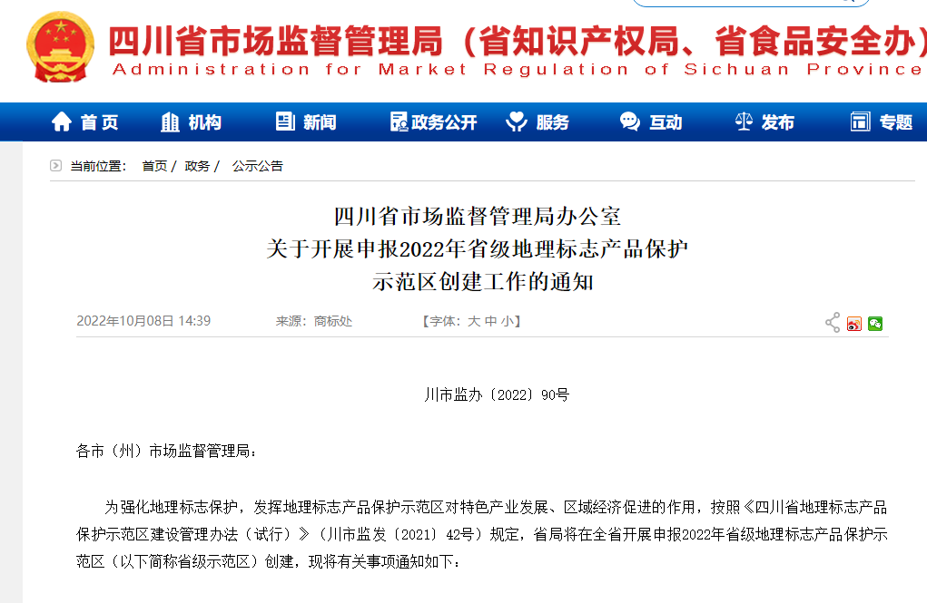 为强化地理标志保护,发挥地理标志产品保护示范区对特色产业发展、区域经济促进的作用,按照《四川省地理标志产品保护示范区建设管理办法(试行)》(川市监发〔2021〕42号)规定,省局将在全省开展申报2022年省级地理标志产品保护示范区(以下简称省级示范区)创建,现将有关事项通知如下: