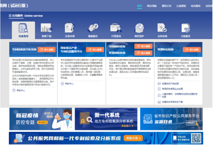 国家知识产权公共服务网(下称公共服务网)于2020年1月16日上线运行。公共服务网整合了国家知识产权局现有知识产权公共服务资源平台,依托国家知识产权局政府网站,初步实现业务服务、政务服务和信息服务的一站式办理,方便创新主体便捷、高效的获取知识产权信息服务资源,激发创新活力。