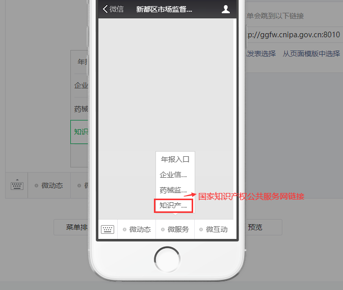 访问“新都区市场监督管理局”微信公众号,在“微服务”里点击“知识产权公共服务”频道。