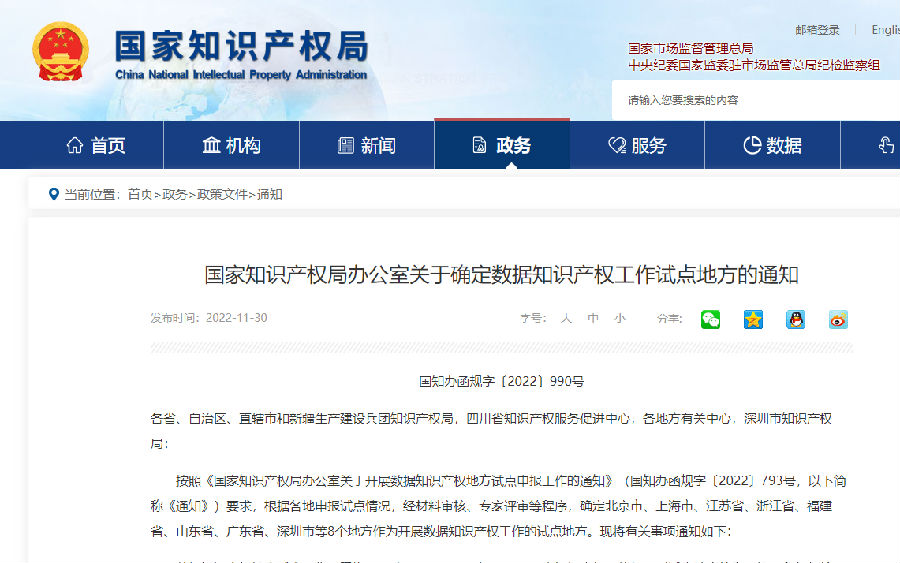 按照《国家知识产权局办公室关于开展数据知识产权地方试点申报工作的通知》(国知办函规字〔2022〕793号,以下简称《通知》)要求,根据各地申报试点情况,经材料审核、专家评审等程序,确定北京市、上海市、江苏省、浙江省、福建省、山东省、广东省、深圳市等8个地方作为开展数据知识产权工作的试点地方。现将有关事项通知如下: