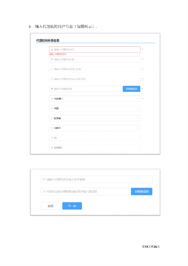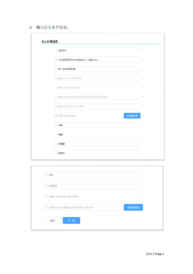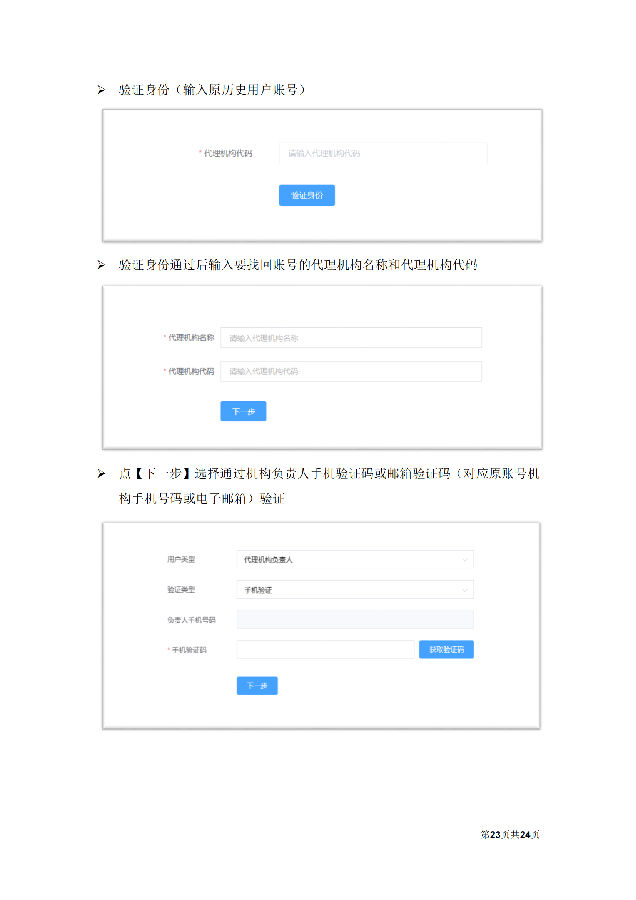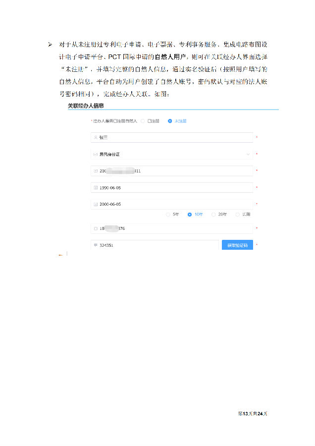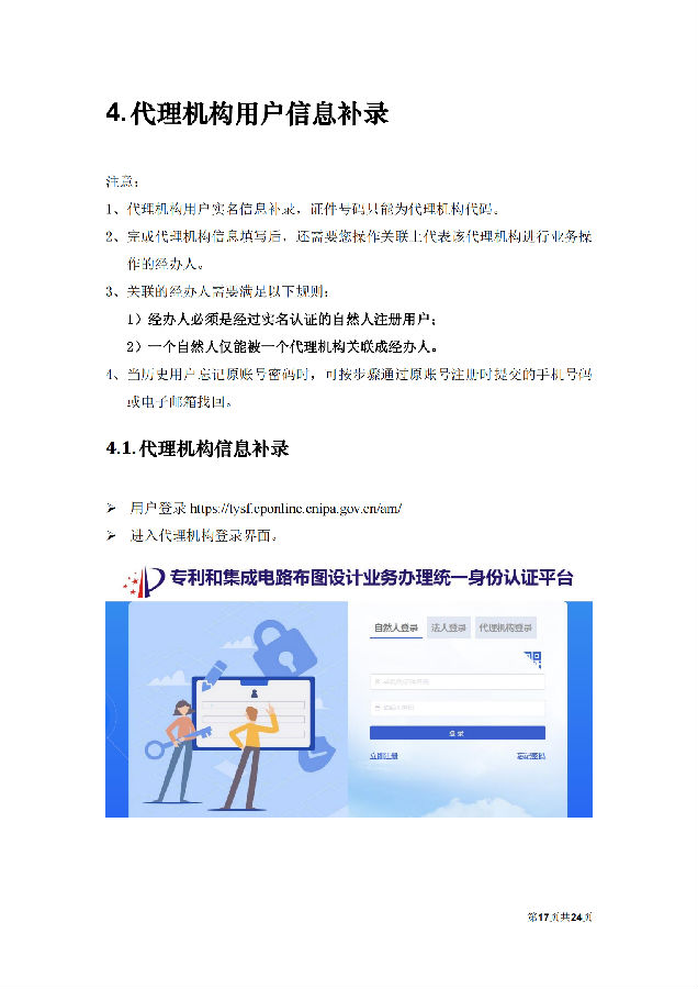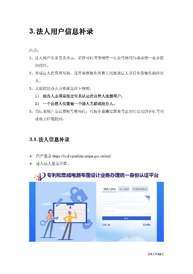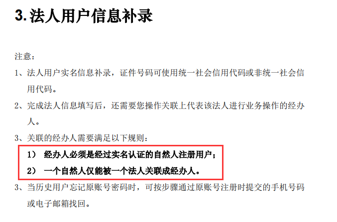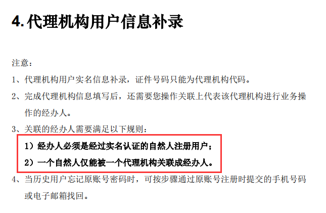 2.法人、代理机构或其他组织完善信息时,应填写法定代表人姓名、证件号码、 手机号码等信息,并指定代表法人、代理机构或其他组织进行业务办理的自然人为经办人。经办人应当是本单位员工,或者是其法定代表人。法人、代理机构账户可以通过账户管理功能,解绑并重新绑定新的自然人为经办人。一个自然人仅能被一个法人/代理机构关联成经办人。