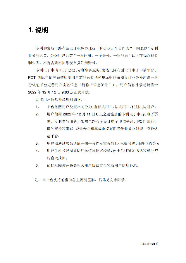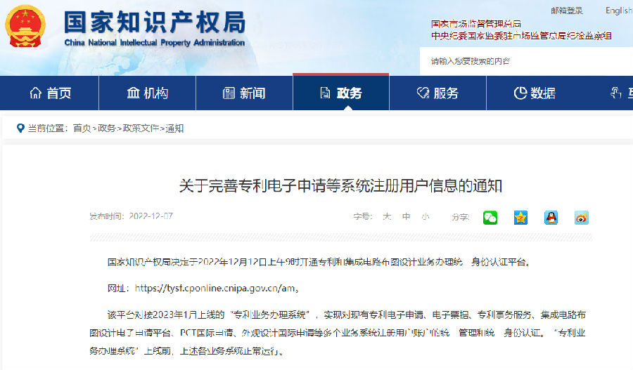 国家知识产权局决定于2022年12月12日上午9时开通专利和集成电路布图设计业务办理统一身份认证平台。