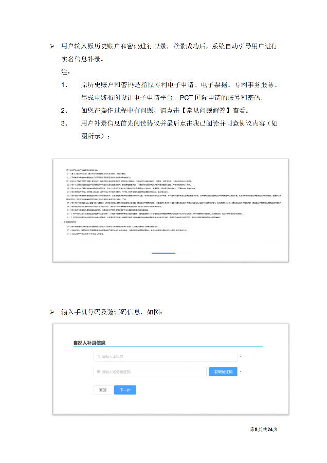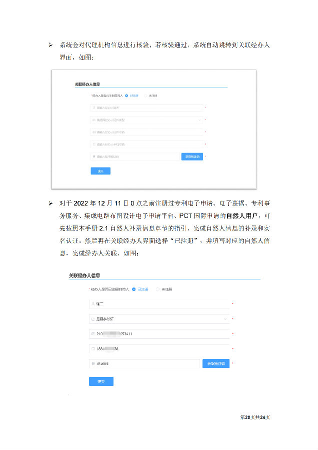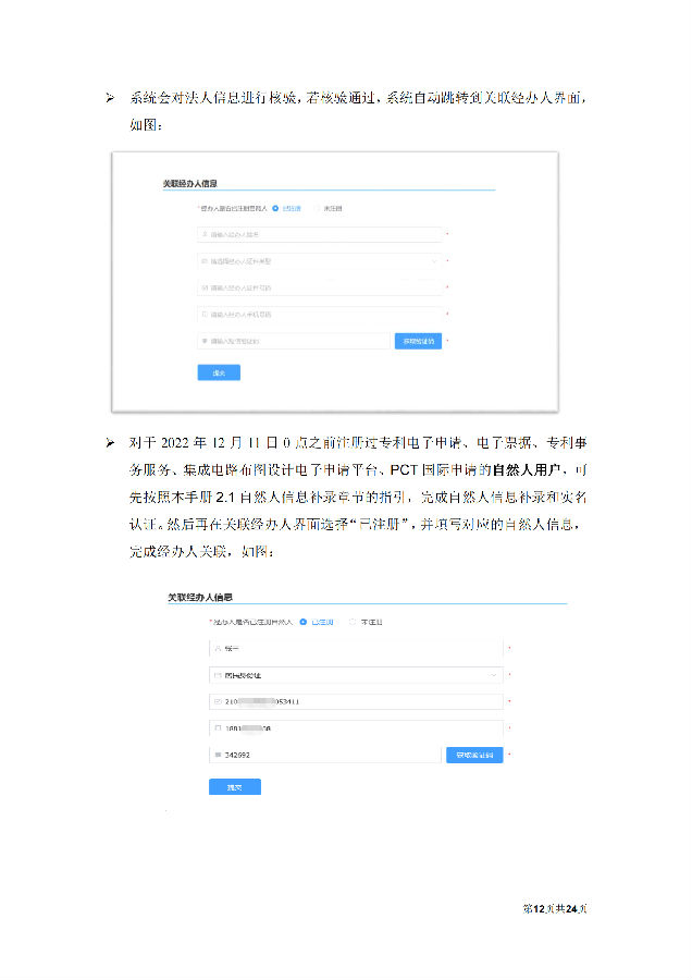 根据《中华人民共和国网络安全法》《中华人民共和国个人信息保护法》《全国人民代表大会常务委员会关于加强网络信息保护的决定》等法律法规的要求,请各系统注册用户及时登录平台,查看并重新签订用户注册协议、完善用户注册信息并绑定手机号。法人注册用户和代理机构注册用户应关联经办人。具体操作详见《完善用户信息操作手册》(附件1)和《常见问题解答》(附件2)。完善上述用户信息后,注册用户即可在“专利业务办理系统”上线后继续办理专利业务。