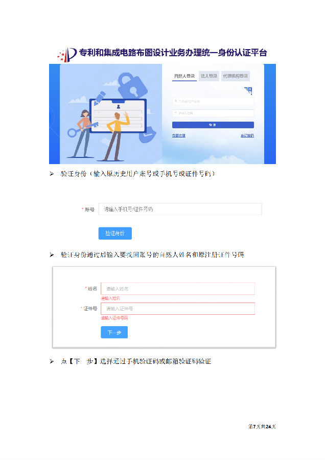 已在中国专利电子申请网、PCT电子申请网、专利事务服务系统、电子票据交付服务系统或集成电路布图设计电子申请平台注册账户(以下统称历史用户) 的用户,可以使用原账号和密码登录专利和集成电路布图设计业务办理统一身份认证平台(以下简称认证平台)完善并实名核验身份信息。
