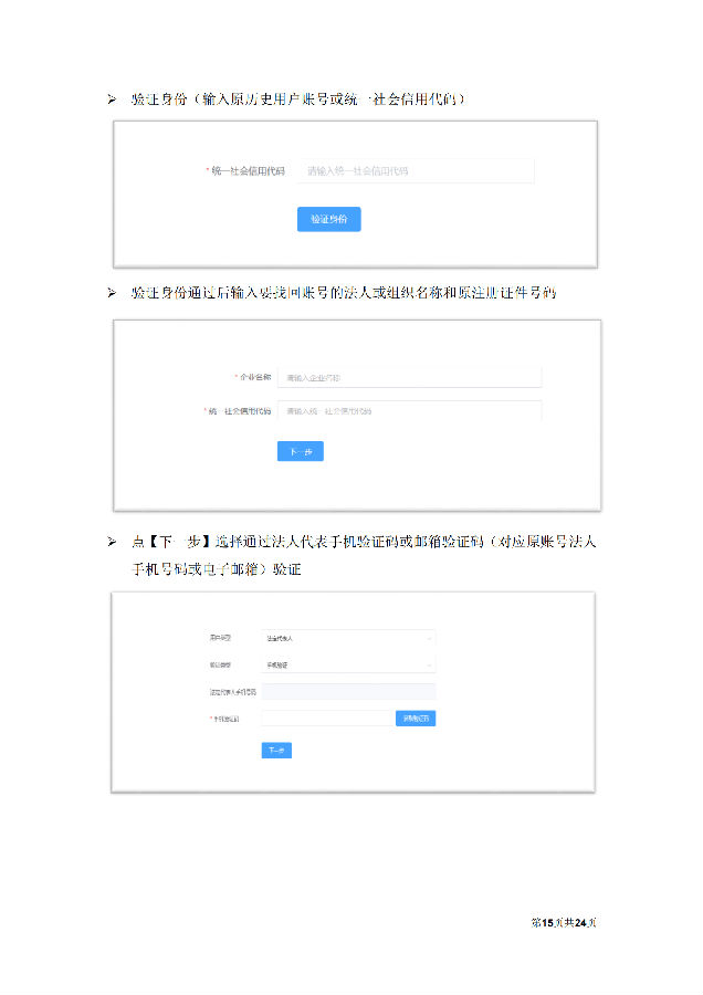 用户忘记原业务系统账号密码,可以通过认证平台的“忘记密码”功能重置密码后登录。自然人用户可以选择原账号信息中预留的手机号码或者电子邮箱找回;法人用户可以选择原账号信息中预留的法人手机号码或者电子邮箱找回,代理机构用户可以选择原账号信息中预留的代理机构手机号码或电子邮箱找回。