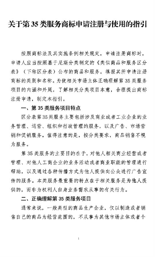 为深入贯彻落实《“十四五”国家知识产权保护和运用规划》关于“加强知识产权源头保护,强化知识产权申请注册质量监管”的部署,帮助相关市场主体正确理解《类似商品和服务区分表》第35类服务项目的内涵和外延,了解相关服务分类项目本意,合理提出商标注册申请,国家知识产权局组织编写了《关于第35类服务商标申请注册与使用的指引》,供相关市场主体参考使用。