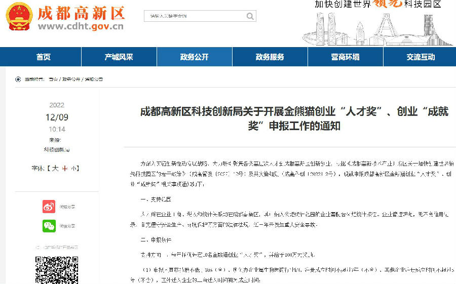 为深入实施创新驱动发展战略,大力吸引聚集各类高层次人才到成都高新区创新创业,根据《成都高新技术产业开发区关于加快创建世界领先科技园区的若干政策》(成高管发〔2022〕12号)及其实施细则(成高科创〔2022〕2号),现就申报成都高新区金熊猫创业“人才奖”、创业“成就奖”相关事项通知如下: