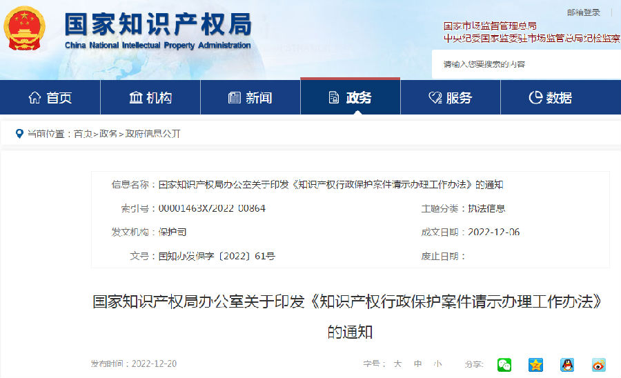 近日,国家知识产权局制定印发《知识产权行政保护案件请示办理工作办法》(以下简称《办法》),进一步规范和优化各级知识产权管理部门专利、商标、地理标志、集成电路布图设计等知识产权行政保护案件请示办理工作,加快构建完善职责明确、统筹有力、有机衔接、高效运转的行政保护案件执法业务指导体系,不断提升全系统知识产权行政保护综合效能。