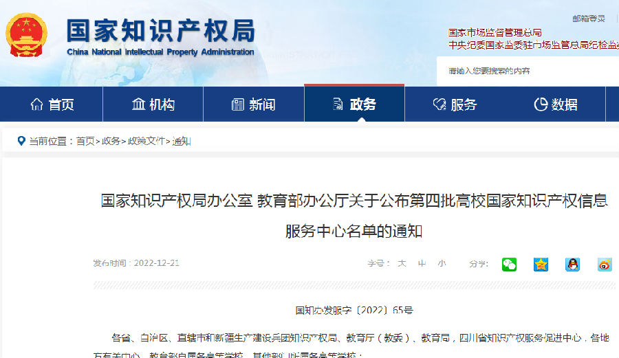 为贯彻习近平总书记“要形成便民利民的知识产权公共服务体系,让创新成果更好惠及人民”的重要指示精神,落实《知识产权强国建设纲要(2021—2035年)》《“十四五”国家知识产权保护和运用规划》《知识产权公共服务“十四五”规划》相关工作部署,健全完善全国知识产权信息公共服务重要网点建设,增强高校在知识产权创造、运用、保护、管理和服务全链条的信息公共服务能力,切实提升高校知识产权工作的能力和水平,按照《高校知识产权信息服务中心建设实施办法》(国知办发服字〔2021〕23号),国家知识产权局、教育部联合开展了第四批高校国家知识产权信息服务中心遴选工作。经自主申报、形式审查、专家初评、复评答辩、名单公示等环节,确定北京师范大学等第四批23家高校国家知识产权信息服务中心,现将名单予以公布。