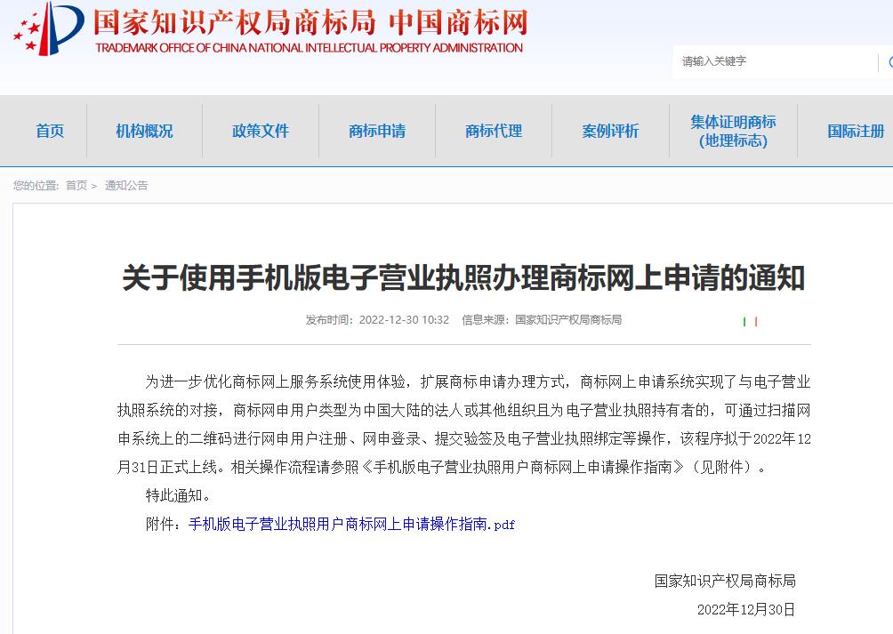 为进一步优化商标网上服务系统使用体验,扩展商标申请办理方式,商标网上申请系统实现了与电子营业执照系统的对接,商标网申用户类型为中国大陆的法人或其他组织且为电子营业执照持有者的,可通过扫描网申系统上的二维码进行网申用户注册、网申登录、提交验签及电子营业执照绑定等操作,该程序拟于2022年12月31日正式上线。相关操作流程请参照《手机版电子营业执照用户商标网上申请操作指南》(见附件)。