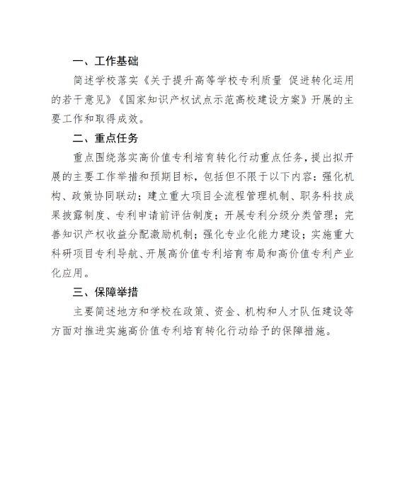 (一)强化统筹指导。教育部、国家知识产权局、科技部将加大对行动实施的协同推进力度,加强经验总结与交流,及时形成可复制、可推广的案例,有力带动全国高校专利质量和转化运用水平提升。鼓励各地各高校结合工作实际,自主开展高价值专利培育和转化工作。