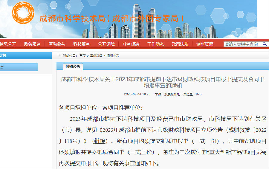2023年成都市提前下达科技项目及经费已由市财政局、市科技局下达到有关区(市)县,详见《2023年成都市提前下达市级财政科技项目立项公告(成财教发〔2022〕118号)》(链接)。所有项目均须提交纸质申报书(一式一份),其中前资助项目还须填报并提交纸质合同书(一式三份),备注为二次拨付的“重大创新产品”项目无需再次提交申报书。现将有关事宜通知如下。