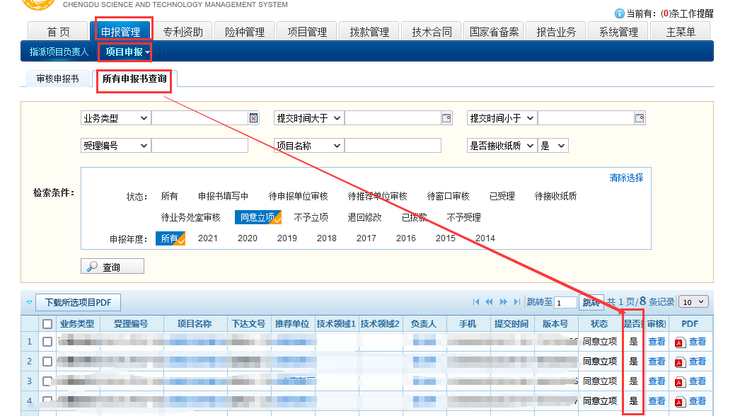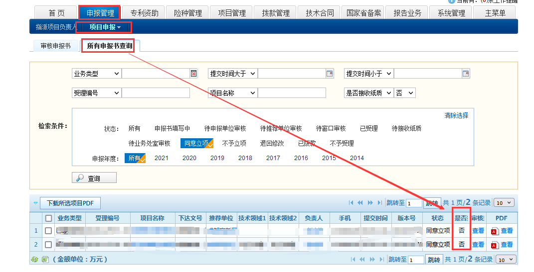 项目负责人可通过申报系统在线查询确认纸件材料办理结果:市政务服务中心科技局窗口未确认收到项目申报书纸件材料前,对应项目申报书在申报系统中“是否接收纸质”状态为“否”(如图5所示);市政务服务中心科技局窗口收到纸件材料后,采用申报系统扫描读取申报书封面页条形码的方式确认收件,申报系统自动将对应项目申报书“是否接收纸质”状态修改为“是”(如图6所示),同时将对应项目合同书(仅限前资助项目)状态修改为“已接收纸质材料”(如图7所示)。