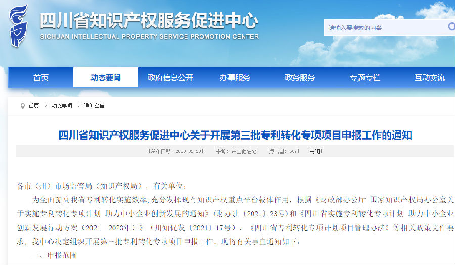 为全面提高我省专利转化实施效率,充分发挥现有知识产权重点平台载体作用,根据《财政部办公厅 国家知识产权局办公室关于实施专利转化专项计划 助力中小企业创新发展的通知》(财办建〔2021〕23号)和《四川省实施专利转化专项计划 助力中小企业创新发展行动方案(2021—2023年)》(川知促发〔2021〕17号)、《四川省专利转化专项计划项目管理办法》等相关政策文件要求,我中心决定组织开展第三批专利转化专项项目申报工作。现将有关事宜通知如下: