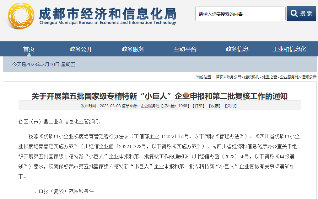 按照《优质中小企业梯度培育管理暂行办法》(工信部企业〔2022〕63号,以下简称《管理办法》)、《四川省优质中小企业梯度培育管理实施方案》(川经信企业函〔2022〕728号,以下简称《实施方案》)、《四川省经济和信息化厅办公室关于组织开展第五批国家级专精特新“小巨人”企业申报和第二批复核工作的通知》(川经信办函〔2023〕55号,以下简称《申报通知》)要求,现就做好我市第五批国家级专精特新“小巨人”企业申报和第二批专精特新“小巨人”企业复核有关事项通知如下。