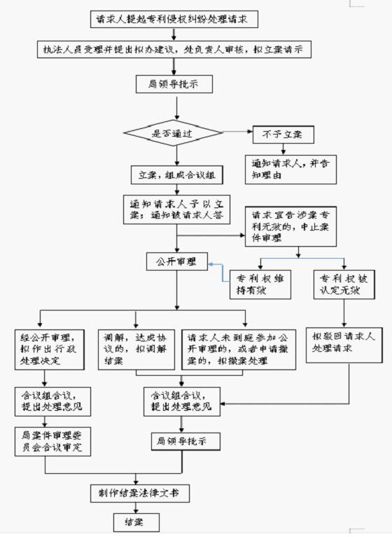 请求人提出处理请求 —— 符合立案条件的进行立案 —— 合议组调查 —— 开庭审理 —— 合议组合议 —— 作出行政裁决