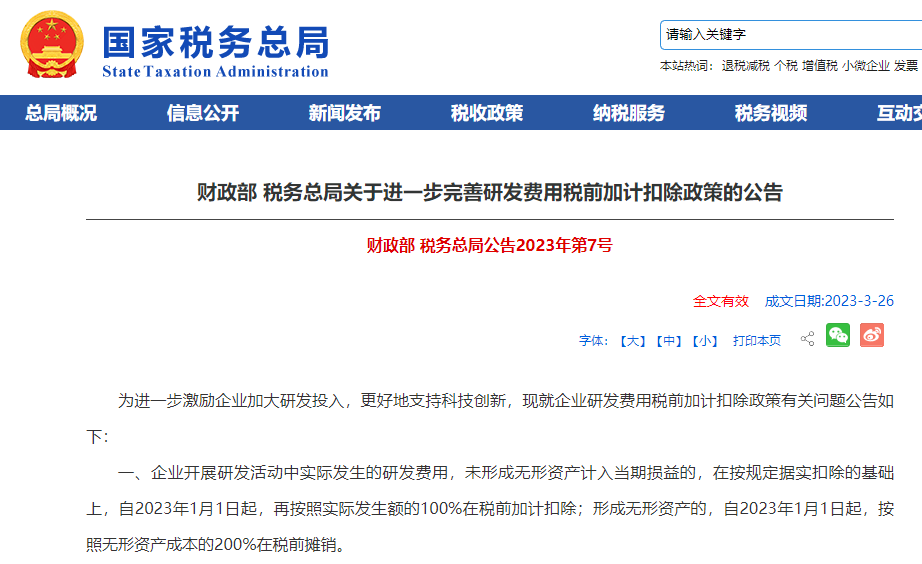 一、企业开展研发活动中实际发生的研发费用,未形成无形资产计入当期损益的,在按规定据实扣除的基础上,自2023年1月1日起,再按照实际发生额的100%在税前加计扣除;形成无形资产的,自2023年1月1日起,按照无形资产成本的200%在税前摊销。