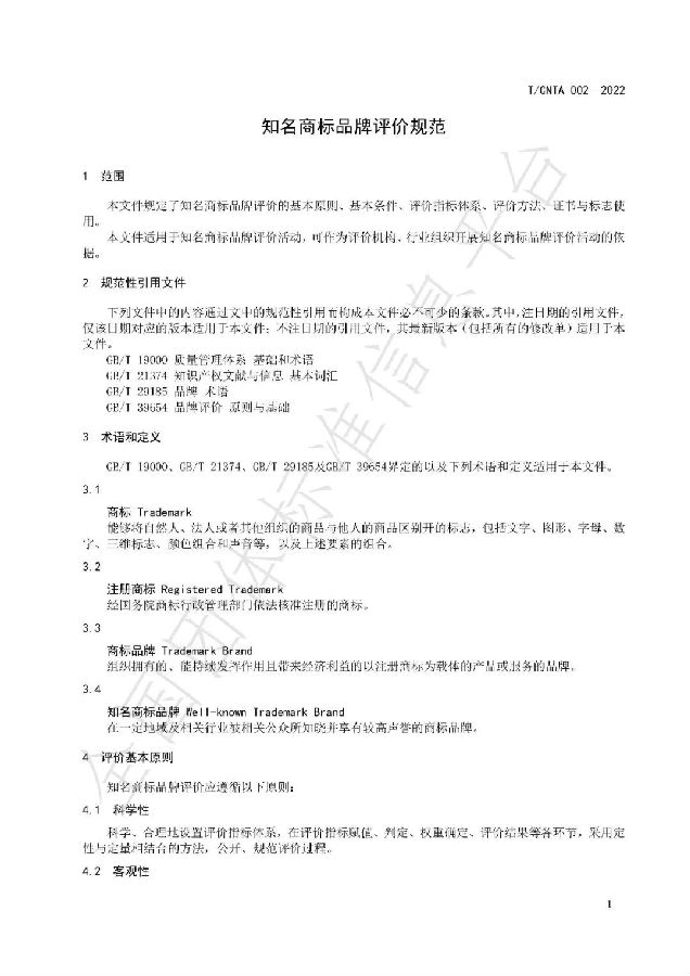 本文件明确了知名商标品牌概念,以注册商标为载体所关联的产品/服务的品牌为评价对象,以商标品牌载体的法律事项、商标品牌的竞争力与影响力、组织的相关管理活动等为评价内容,规范知名商标品牌评价活动。