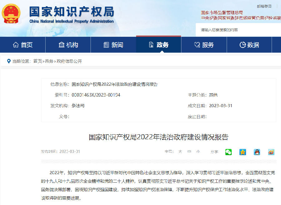 近日,国家知识产权局网站发布《国家知识产权局2022年法治政府建设情况报告》,其中在提到: