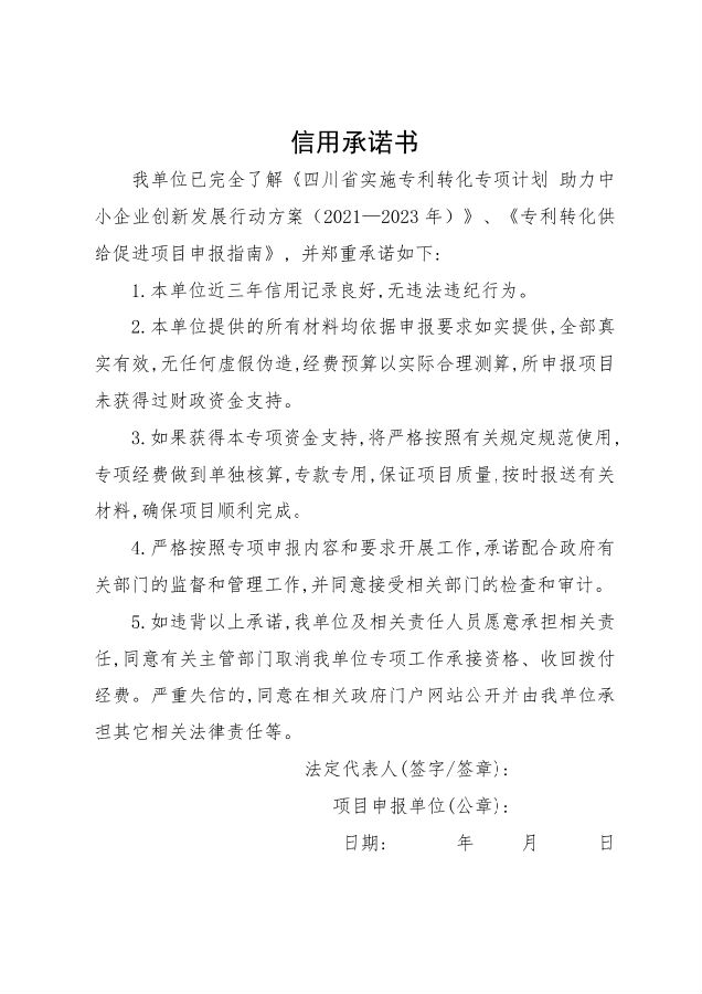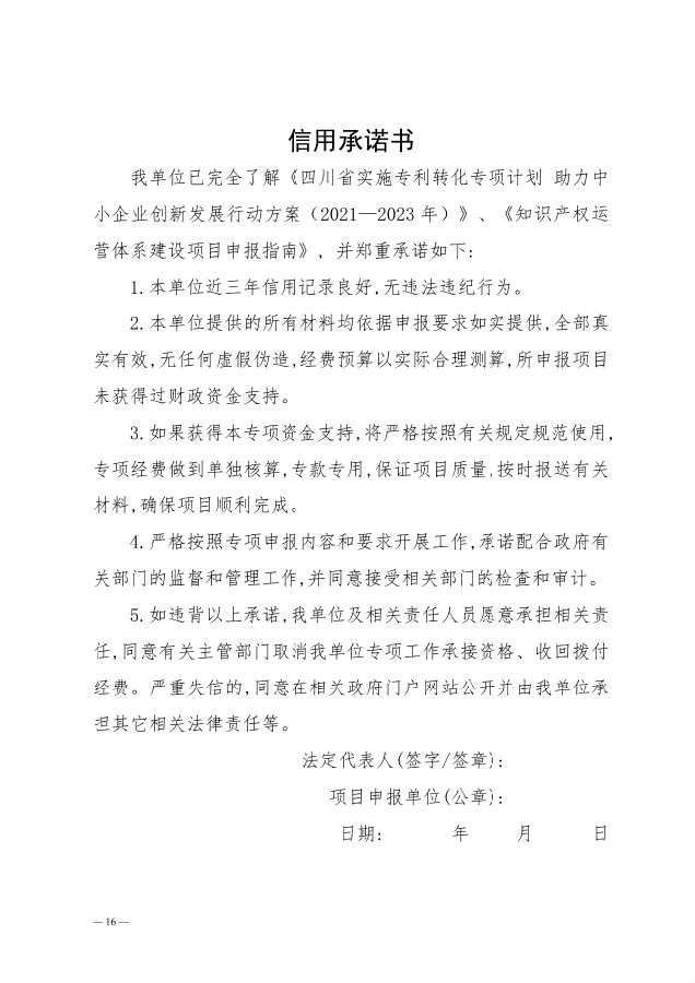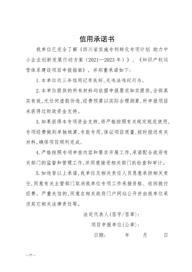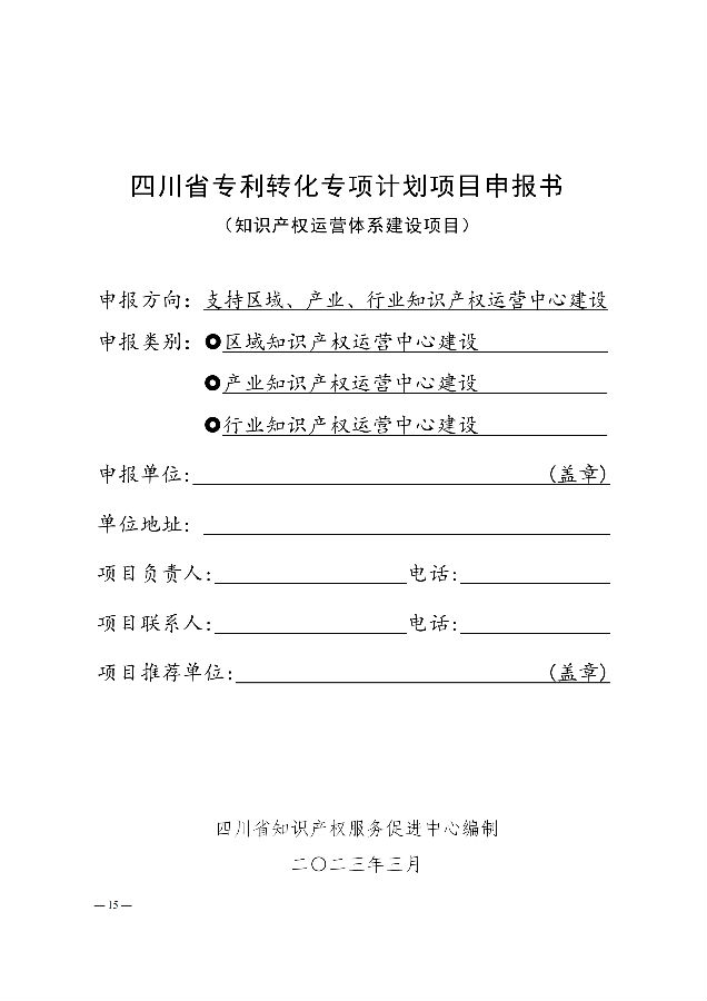为全面提高我省专利转化实施效率,充分发挥现有知识产权重点平台载体作用,根据《财政部办公厅 国家知识产权局办公室关于实施专利转化专项计划 助力中小企业创新发展的通知》(财办建〔2021〕23号)和《四川省实施专利转化专项计划 助力中小企业创新发展行动方案(2021—2023年)》(川知促发〔2021〕17号)、《四川省专利转化专项计划项目管理办法》等相关政策文件要求,我中心决定组织开展第四批专利转化专项项目申报工作。现将有关事宜通知如下: