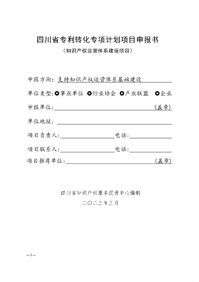 (一)项目申报。符合支持方向的项目申报主体,按照属地原则,向所在地知识产权管理部门申报。申报单位按照时限要求将申报材料的纸件(一式二份。需用A4纸打印并装订成册,装订线在左。封面、指定盖章处及骑缝处均需加盖公章)和电子件(可编辑版word及盖章扫描PDF版)报市(州)知识产权管理部门。市(州)知识产权管理部门负责本区域项目申报组织、初审推荐工作,汇总申报项目后报送至省知识产权中心产业促进处,邮箱sczlss@163.com,标题格式统一为“XXX市(州)+专利转化专项申报”。