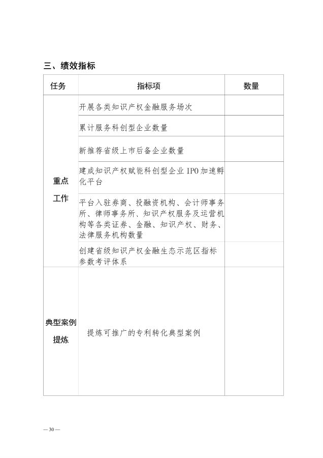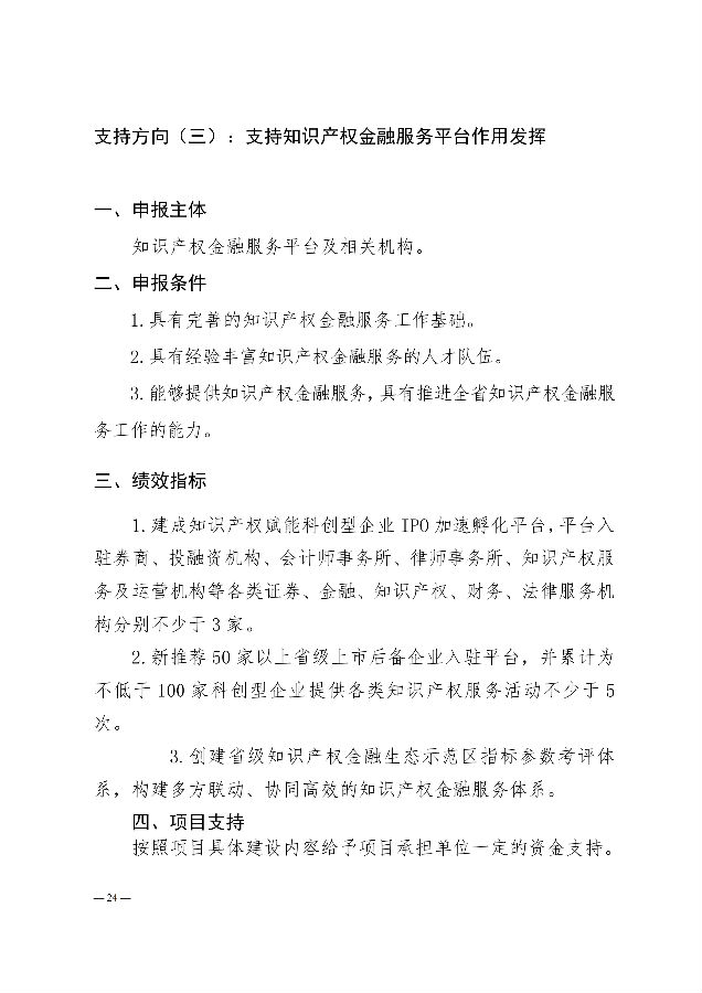 (二)知识产权运营体系建设项目:支持运营体系基础建设项目,创建省级知识产权金融生态示范区。支持区域、产业、行业知识产权运营中心建设和功能拓展,全力构建“1+N”的知识产权运营体系。支持知识产权金融服务平台作用发挥项目,创新提供知识产权赋能科创型企业IPO加速孵化、知识产权金融生态示范区指标参数设定等专业化服务。