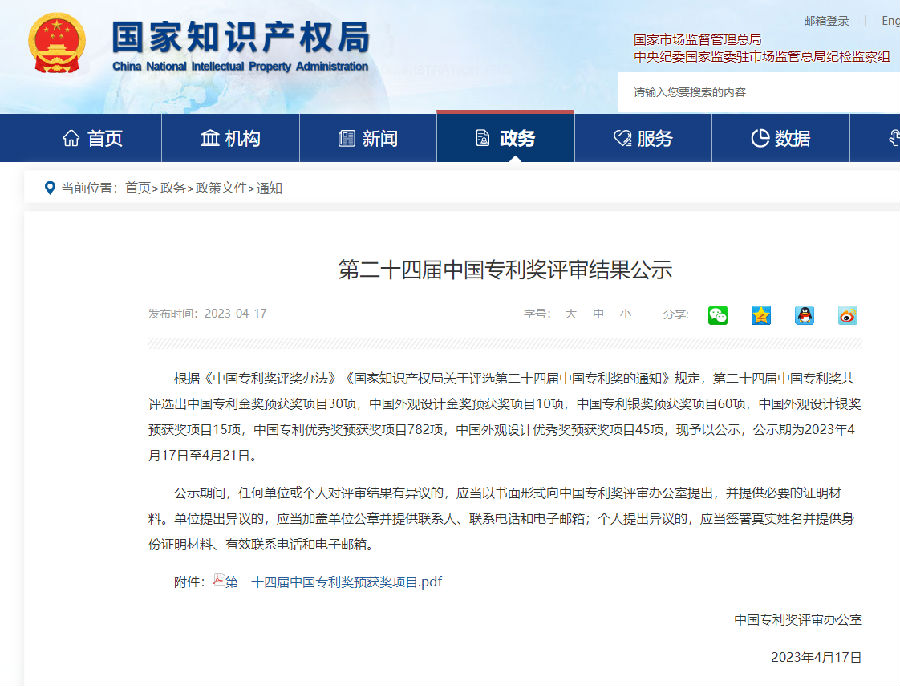 根据《中国专利奖评奖办法》《国家知识产权局关于评选第二十四届中国专利奖的通知》规定,第二十四届中国专利奖共评选出中国专利金奖预获奖项目30项,中国外观设计金奖预获奖项目10项,中国专利银奖预获奖项目60项,中国外观设计银奖预获奖项目15项,中国专利优秀奖预获奖项目782项,中国外观设计优秀奖预获奖项目45项,现予以公示,公示期为2023年4月17日至4月21日。