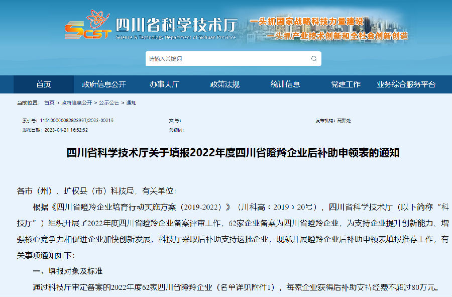 通过科技厅审定备案的2022年度62家四川省瞪羚企业(名单详见附件1),每家企业获得后补助支持经费不超过80万元。