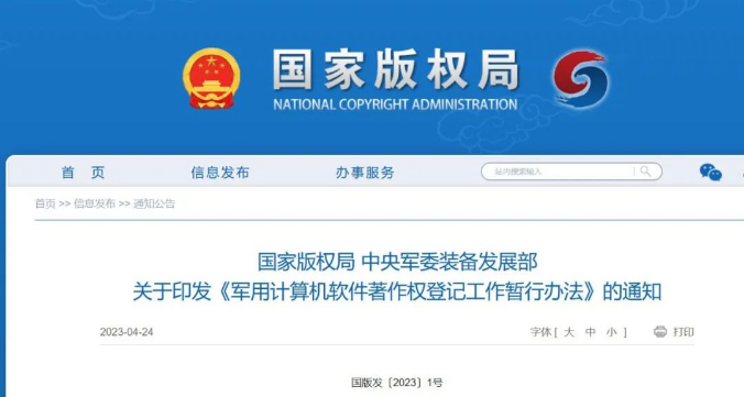 近日,国家版权局 中央军委装备发展部印发关于《军用计算机软件著作权登记工作暂行办法》的通知。其中提到,本办法自印发之日起施行。