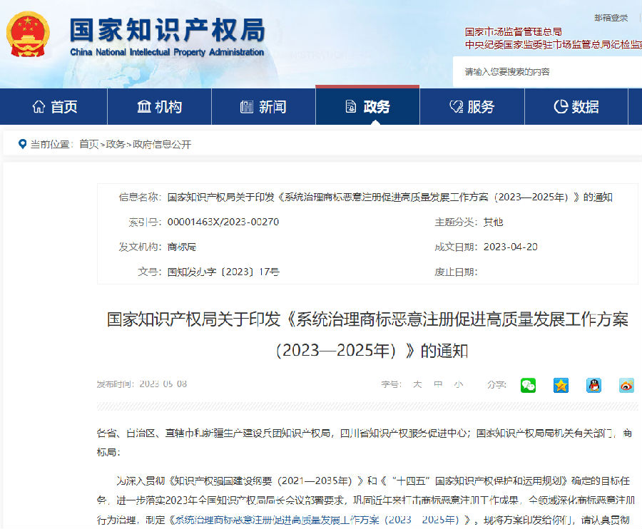 国家知识产权局关于印发《系统治理商标恶意注册促进高质量发展工作方案(2023—2025年)》的通知