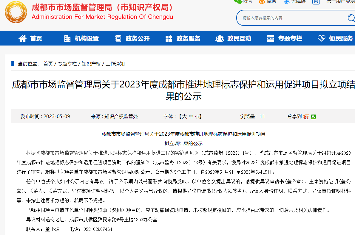 根据《成都市市场监督管理局关于推进地理标志保护和运用促进工程的实施意见》(成市监规〔2023〕1号)、《成都市市场监督管理局关于组织开展2023年度成都市推进地理标志保护和运用促进项目资助工作的通知》(成市监办〔2023〕48号)有关要求,我局对2023年度成都市推进地理标志保护和运用促进项目进行了审查。现将拟立项名单在成都市市场监督管理局网站公示,公示期为5个工作日,自2023年5 月9日至2023年5月15日。