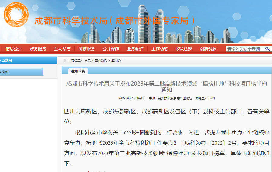 根据市委市政府关于产业建圈强链的工作要求,为进一步提升我市重点产业链核心竞争力,按照《2023年全市科技创新工作要点》(成科领办〔2022〕2号)要求的项目方向,现发布2023年第二批高新技术领域“揭榜挂帅”科技项目榜单,具体事项通知如下。