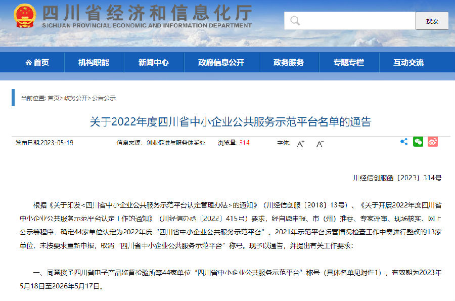 一、同意授予四川省电子产品监督检验所等44家单位“四川省中小企业公共服务示范平台”称号(具体名单见附件1),有效期为2023年5月18日至2026年5月17日。