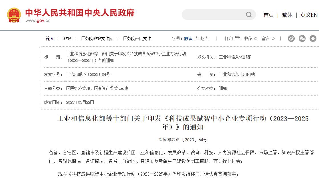 现将《科技成果赋智中小企业专项行动(2023—2025年)》印发给你们,请认真贯彻落实。