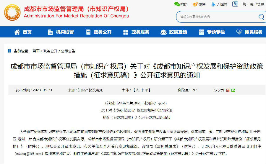 成都市市场监督管理局(市知识产权局)关于对《成都市知识产权发展和保护资助政策措施(征求意见稿)》公开征求意见的通知