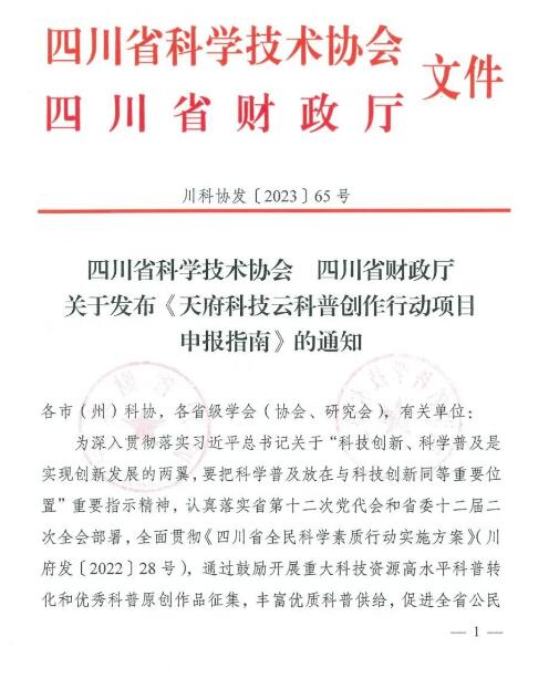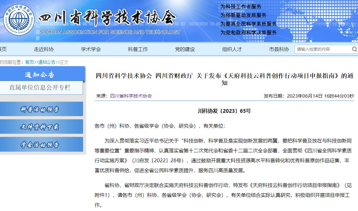 省科协、省财政厅决定联合实施天府科技云科普创作行动,特发布《天府科技云科普创作行动项目申报指南》(见附件1),请各市(州)科协、各省级学会(协会、研究会)、有关单位结合实际认真研究,积极组织开展项目申报工作。