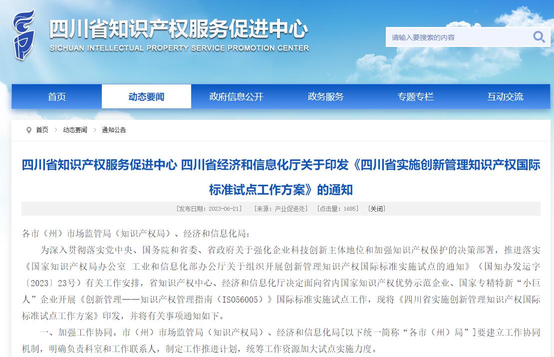 为深入贯彻落实党中央、国务院和省委、省政府关于强化企业科技创新主体地位和加强知识产权保护的决策部署,推进落实《国家知识产权局办公室 工业和信息化部办公厅关于组织开展创新管理知识产权国际标准实施试点的通知》(国知办发运字〔2023〕23号)有关工作安排,省知识产权中心、经济和信息化厅决定面向省内国家知识产权优势示范企业、国家专精特新“小巨人”企业开展《创新管理——知识产权管理指南(ISO56005)》国际标准实施试点工作,现将《四川省实施创新管理知识产权国际标准试点工作方案》印发,并将有关事项通知如下。