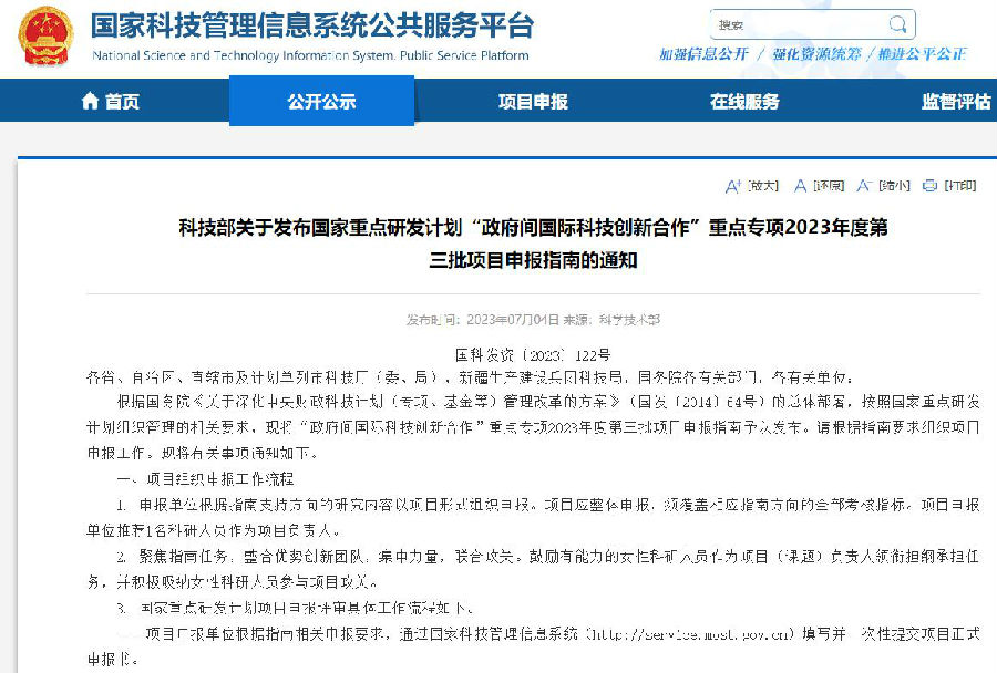 根据国务院《关于深化中央财政科技计划(专项、基金等)管理改革的方案》(国发〔2014〕64号)的总体部署,按照国家重点研发计划组织管理的相关要求,现将“政府间国际科技创新合作”重点专项2023年度第三批项目申报指南予以发布。请根据指南要求组织项目申报工作。现将有关事项通知如下。
