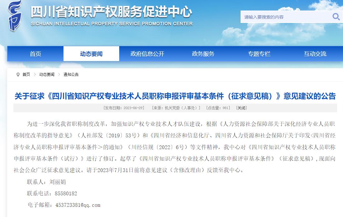 为进一步深化我省职称制度改革,加强知识产权专业技术人才队伍建设,根据《人力资源社会保障部关于深化经济专业人员职称制度改革的指导意见》(人社部发〔2019〕53号)和《四川省经济和信息化厅、四川省人力资源和社会保障厅关于印发<四川省经济专业人员职称申报评审基本条件>的通知》(川经信规〔2022〕6号)等文件精神,我中心对《四川省知识产权专业技术人员职称申报评审基本条件(试行)》进行了修订。起草了《四川省知识产权专业技术人员职称申报评审基本条件》(征求意见稿),现面向社会公众广泛征求意见建议。请于2023年7月31日前将意见建议(含修改理由)反馈至我中心。