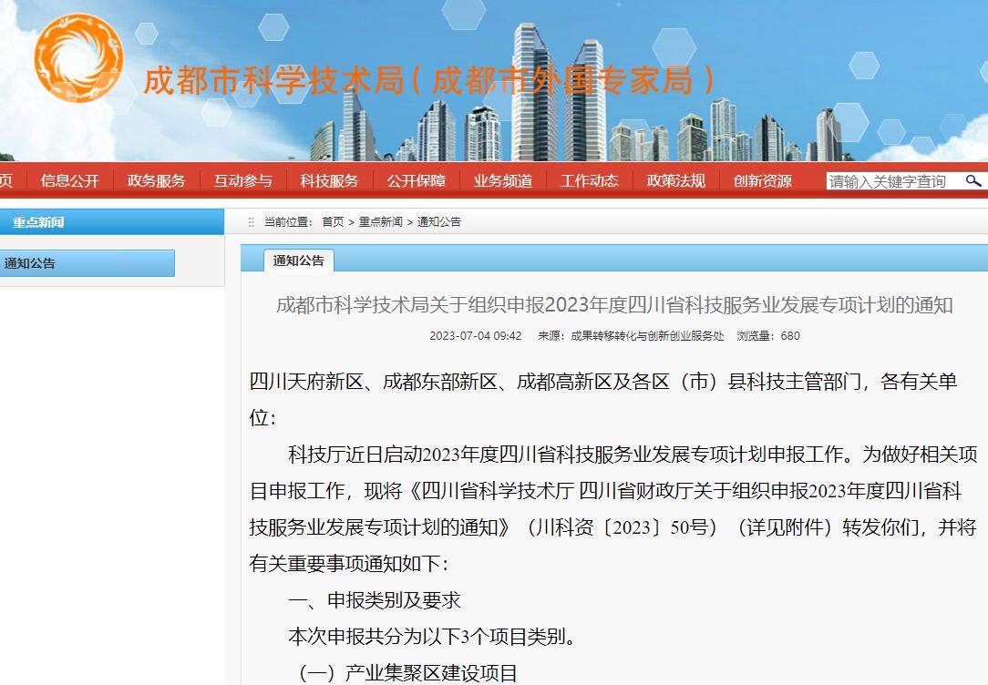 科技厅近日启动2023年度四川省科技服务业发展专项计划申报工作。为做好相关项目申报工作,现将《四川省科学技术厅 四川省财政厅关于组织申报2023年度四川省科技服务业发展专项计划的通知》(川科资〔2023〕50号)(详见附件)转发你们,并将有关重要事项通知如下: