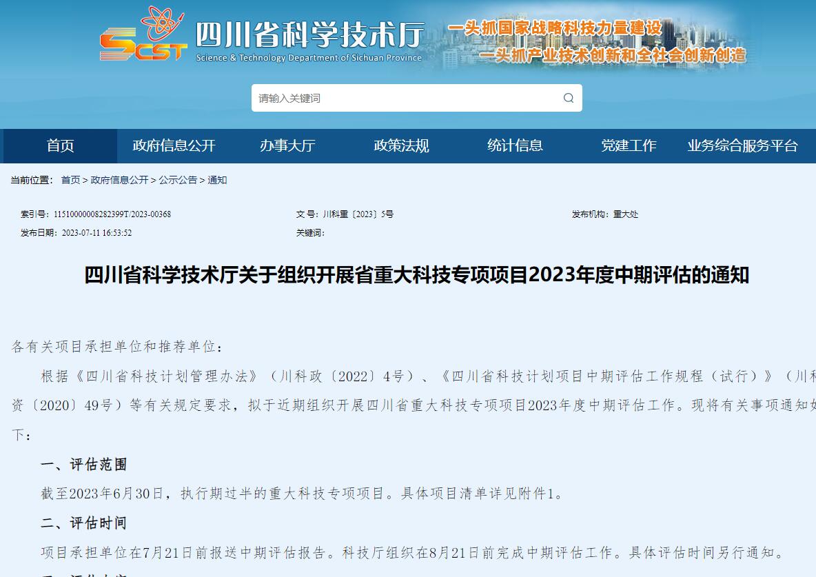 根据《四川省科技计划管理办法》(川科政〔2022〕4号)、《四川省科技计划项目中期评估工作规程(试行)》(川科资〔2020〕49号)等有关规定要求,拟于近期组织开展四川省重大科技专项项目2023年度中期评估工作。现将有关事项通知如下:
