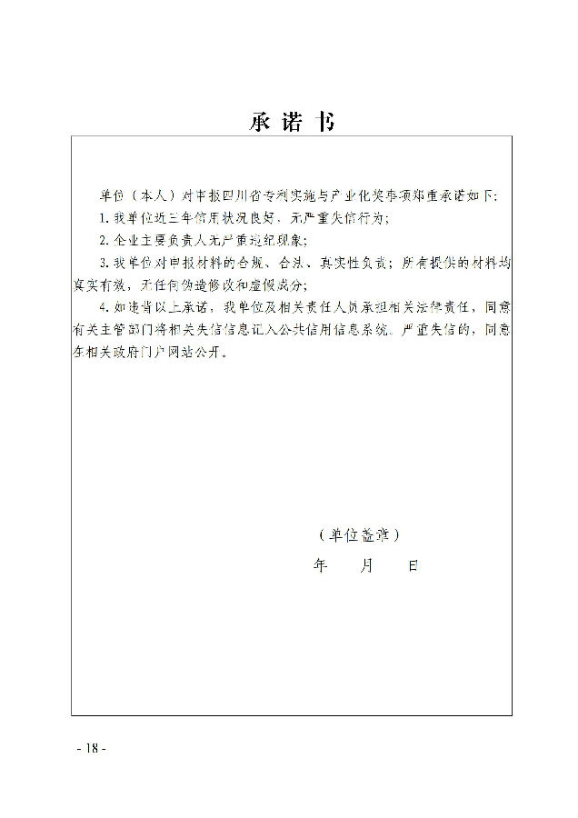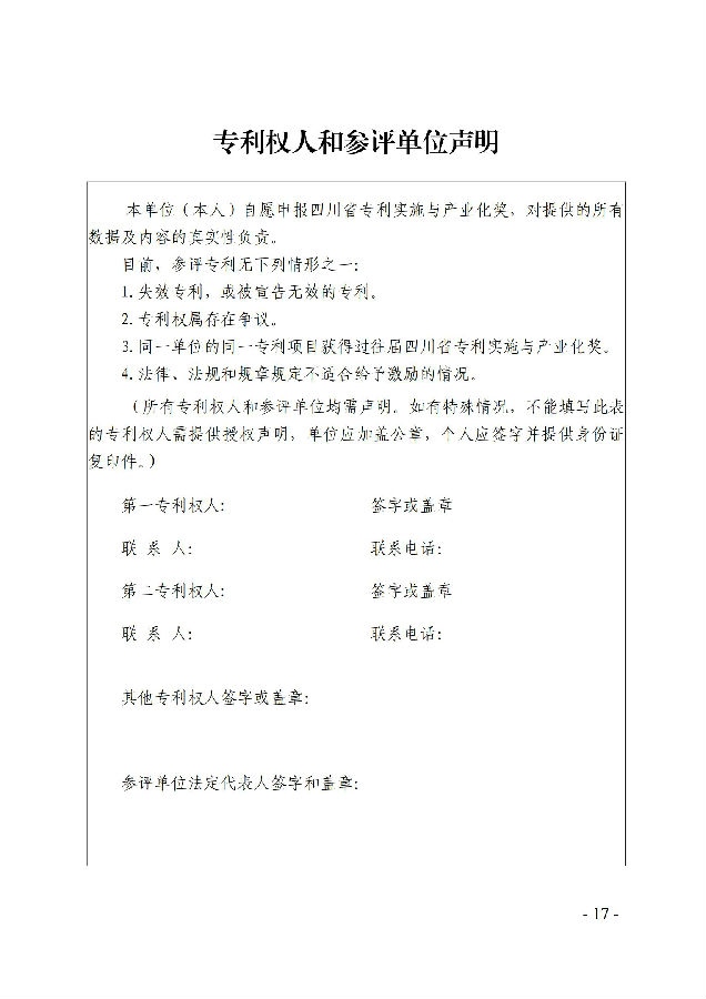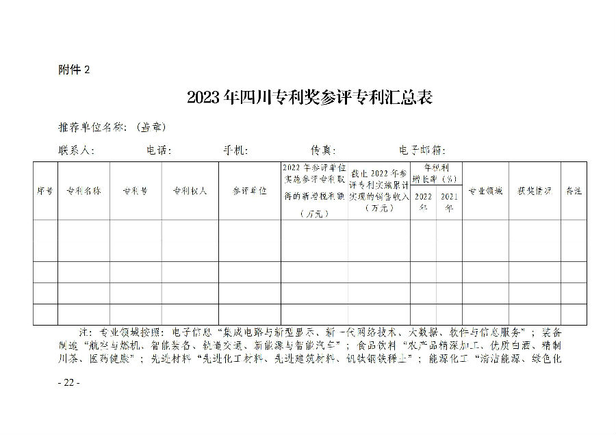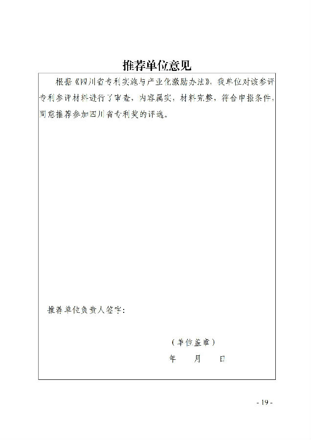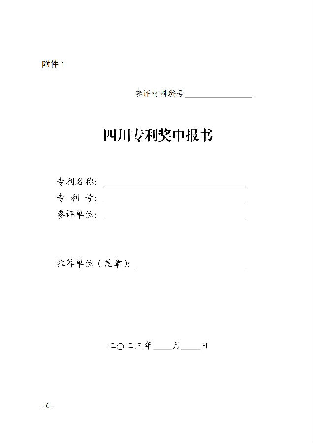 点击文末链接可下载四川专利奖申报书、四川专利奖参评专利汇总表、推荐函、附件证明材料要求。