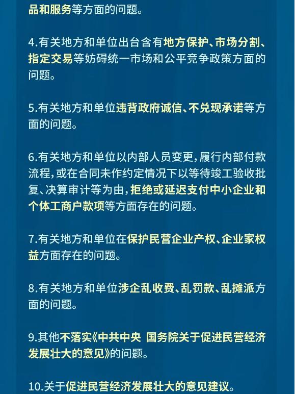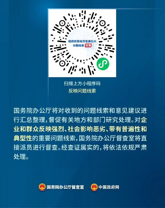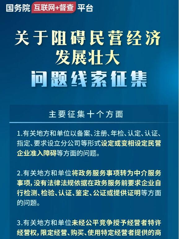 为贯彻落实《中共中央 国务院关于促进民营经济发展壮大的意见》,推动解决民营经济发展壮大面临的困难和问题,根据有关工作部署,国务院“互联网+督查”平台从即日起面向社会征集十个方面的问题线索和意见建议。